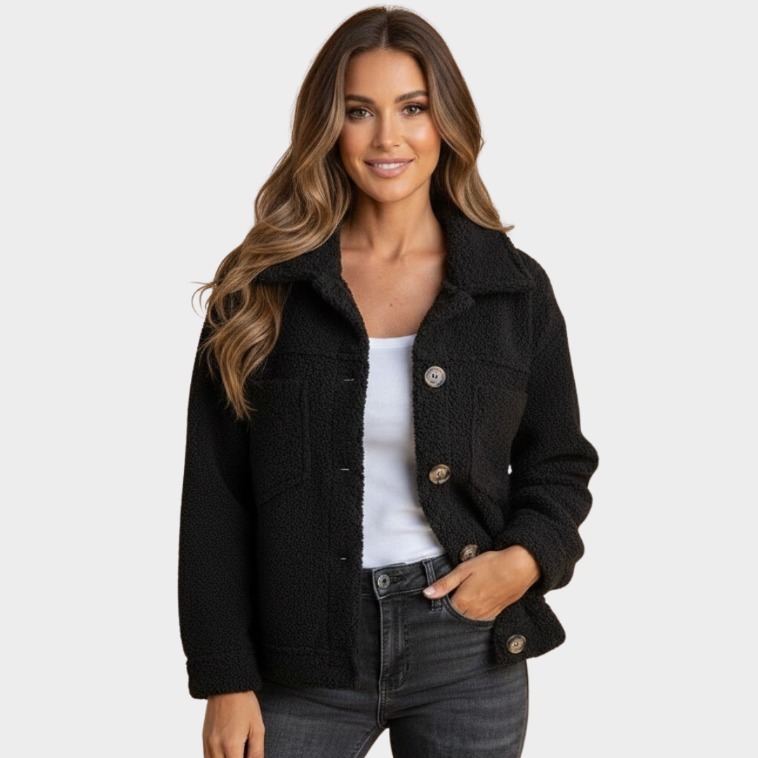 This women’s jacket is designed for everyday wear in cooler weather. It comes in a solid black color and is made from fleece material that provides lightweight warmth. The button-front closure allows for easy layering over shirts and tops. Designed for adult women, this jacket is suitable for casual use during fall and winter.